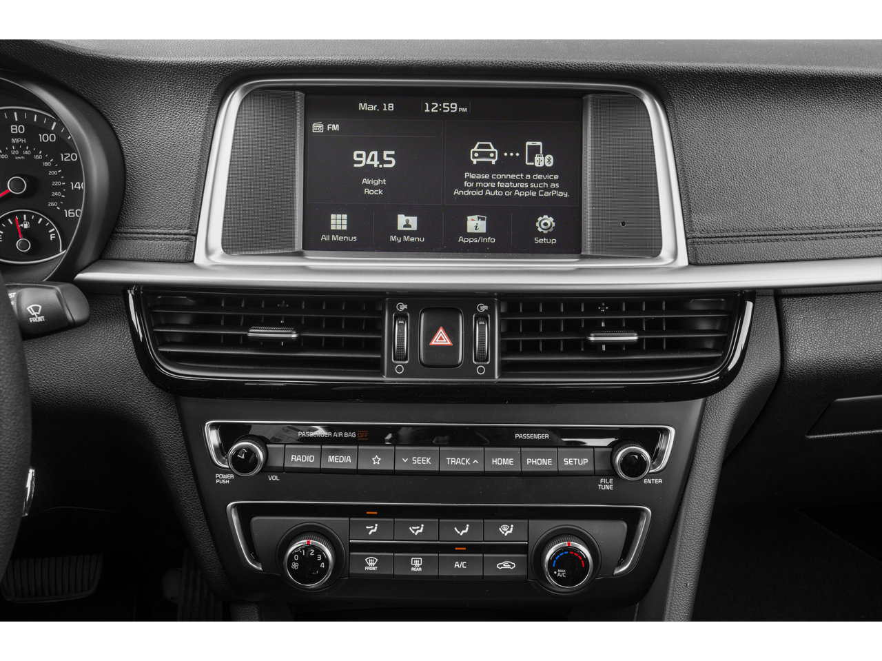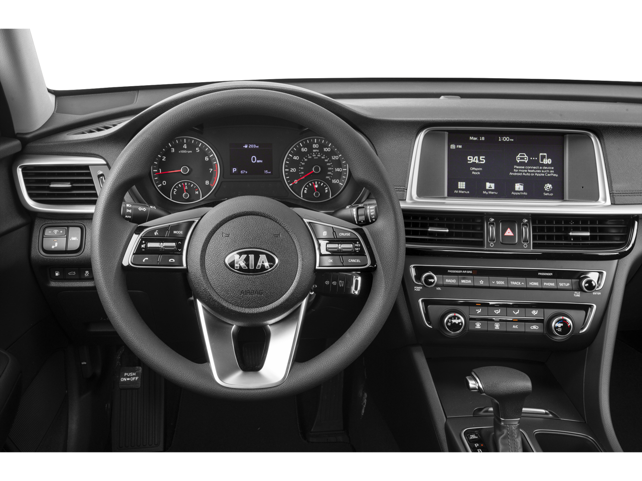 Inside, the Optima's well-designed cabin showcases a range of premium amenities, including cloth seating, a tilt and telescoping steering wheel, and a user-friendly infotainment system with AM/FM radio, MP3 playback, and seamless integration with your smartphone via Apple CarPlay and Android Auto. The spacious interior and split-folding rear seats offer ample room for passengers and cargo, making this Optima an ideal choice for your daily commute or weekend getaways.