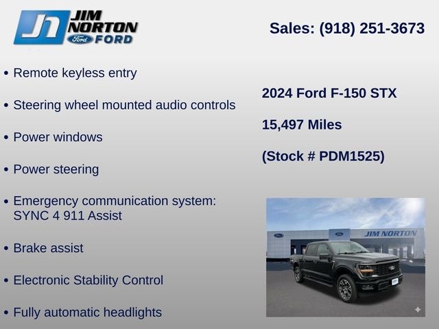 Research the 2024 Ford F-150 Broken Arrow at Jim Norton Ford. Here are pictures, specs, and pricing for the 2024 Ford F-150 4D SuperCrew STX located near Broken Arrow. You can call our Broken Arrow, OK location, serving Broken Arrow, OK, Tulsa, Bixby, Owasso OK to inquire about the 2024 Ford F-150 4D SuperCrew STX or another 2024 Ford F-150 4D SuperCrew STX.2024 Ford F-150 STX Broken Arrow Oklahoma